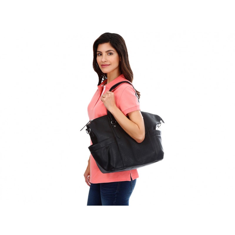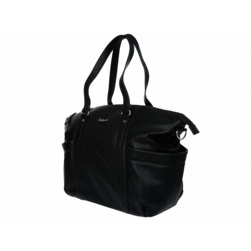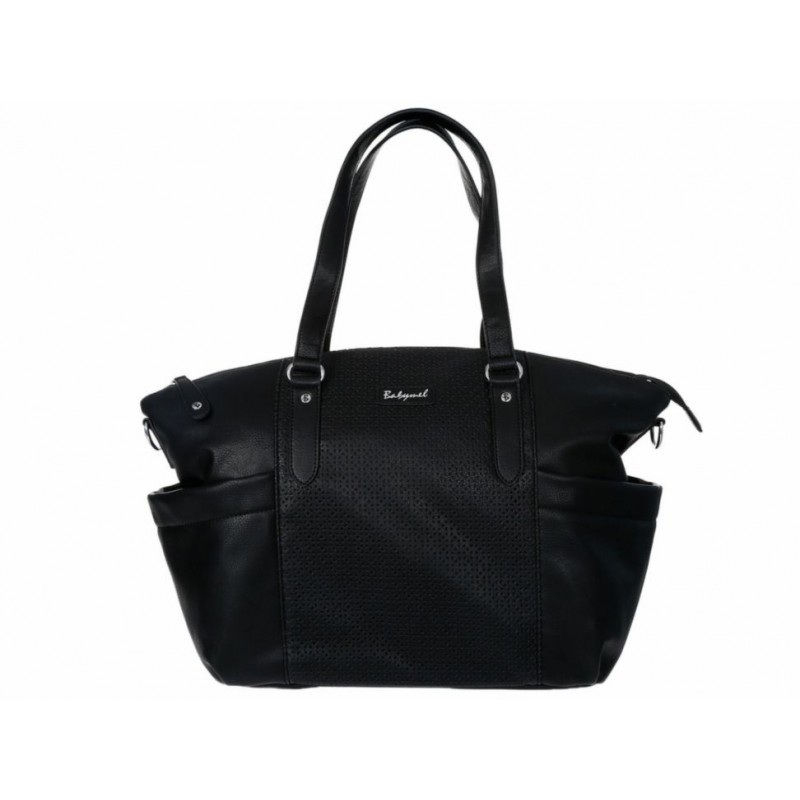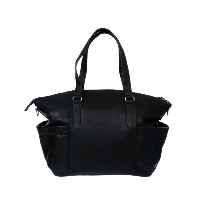 Pañalera con fijación de cierre en compartimento principal, doble asa de mano, correa ajustable y desmontable, bolsillos laterales y detalle metálico alusivo a la marca